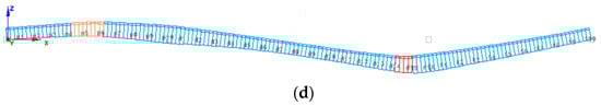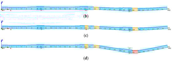During the loading phases, two performance criteria are defined: the reinforcement yield and the chord rotation capacity. The reinforcement yield is considered to be reached when reinforcement strain exceeds the value of 0.0012. The chord rotation capacity is calculated based on EN 1998-3:2005 Annex A []. The load is applied as displacement below the pier S3 that simulated the foundation settlement in steps of 0.01 m. The results show that reinforcement yield occurred in the next order: (1) at node 28 located 2.35 m from pier S3, at the settlement of S3 pier of 0.14 m; (2) at node 20 located 5.9 m from pier S2, at the settlement of S3 pier of 0.48 m, and (3) at node 18 located above S2, at the settlement of S3 pier of 0.65 m. Chord rotation capacity was reached at node 28 for settlement of S3 pier equal to 0.71 m. Figure 8a–d shows a schematic bridge deformed shape at the analysis step when checked performance criteria are reached.