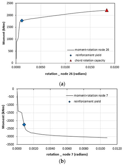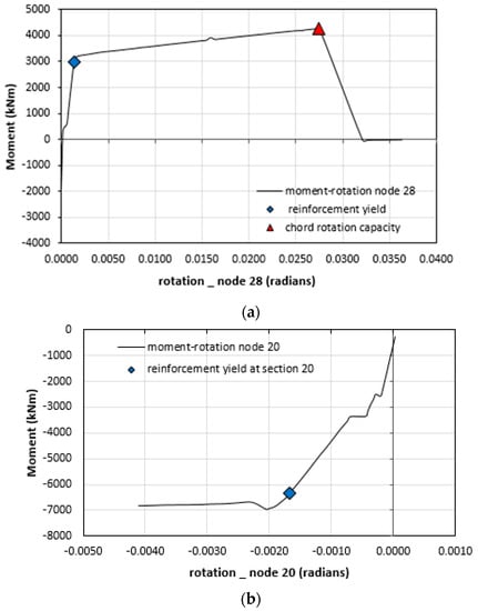 Figure 9 shows the bending moment-rotation diagrams for nodes 28, 20, and 18. The points of reaching performance criteria are marked on the charts.