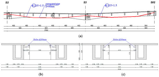 Layout of the prestressing cable tendons: (a) longitudinal section (half bridge) and (b) cross-section above piers S2 and S3 and (c) cross-section above pier S1.