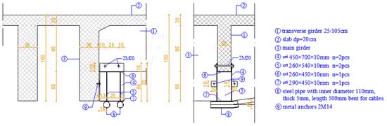 The arrangement of cable tendons that favorably affects the load-bearing capacity, balances the bridge system, and ensures its adequate resistance was adopted. Two 15 × 155 mm2 high-grade steel cable tendons of the BBR VT CONA CMI system [] with a tensile strength of 1860 MPa are used for prestressing. The tendons are placed along the inside part of the main girder (at the supports in the upper zone and in the spans in the bottom zone). The prestressing cable tendons’ layout is linear (see Figure 10). One tendon is adopted along each main girder for the entire bridge length, and another two tendons are added in two damaged middle spans (Figure 10). The prestressing is done from both ends. The steel corrugated pipes are used for tendons installation. The deviators have been placed at the span transverse girders to provide adequate eccentricity of the prestressing force (Figure 11). The tendons are embedded into the corrugated pipes and injected with cement emulsion. At the end supports, the existing transverse girders are strengthened to be able to restrain the tendon forces in the anchoring zone. The steel construction of the deviator is designed for the forces caused by tendons (deflection forces and forces caused by friction forces) in tensioning phase and exploitation state using prescribed safety coefficients.