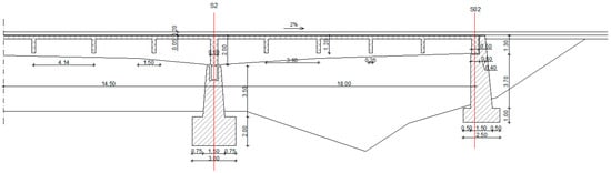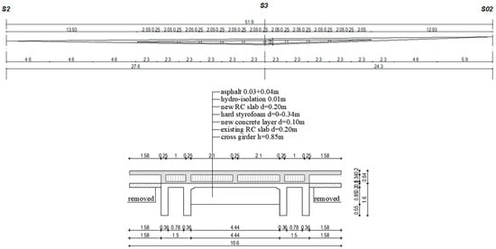 In order to form the appropriate longitudinal profile level of the bridge at the place of the pier river settlement, a structure of the RC grill beams with a hard styrofoam filling was designed. The geometry of the RC grill structure is shown in Figure 12. The RC grill structure is designed at the settled part of the bridge (between piers S2-S3-S02). The RC grill structure consists of a 10 cm thick RC concrete layer that is placed over the existing RC slab, four longitudinal girders that follow the geometry of the settled alignment, transverse girders that are placed at a distance of 2.3 m, and an upper new RC slab with a thickness of 0.20 m. The bonding of the newly added grill structure was accomplished with steel anchors drilled into the existing concrete and by applying a coating for the bonding of old and new concrete.