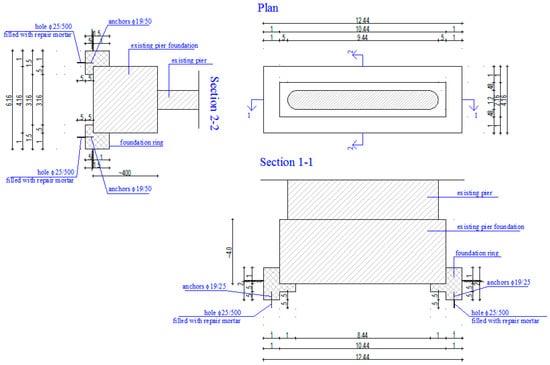 The foundation of the river settled pier was strengthened by under-concreting and making the RC ring around the existing foundation. Under-concreting was done in camps with the prior cleaning of the degraded rock mass and the installation of anchors for the connection of rock and new concrete. The details of the foundation strengthening are shown in Figure 13.