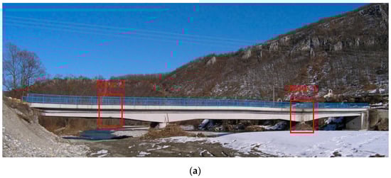 Due to missing or incomplete design documentation for the considered bridges, it was necessary to conduct additional on-site tests to determine the characteristics of the material. Where relevant (bridge 1 and bridge 2), the compressive strength of concrete in the RC deck was determined by extracting and testing four cylindrical concrete specimens from the bridge deck with a diameter and height of 0.10 m. For bridge 1, all specimens showed the high quality of the existing concrete, i.e., compressive strength exceeding 50 MPa or an average of 55.51 MPa. For bridge 2, the compressive strength is 25 MPa, although the designed compressive strength was 30 MPa. Further, it was determined that the smooth reinforcement has been used with a characteristic tensile strength of 360 MPa and a yield strength of 240 MPa. Concrete and steel mechanical properties were in line with national provisions valid at the time of bridge construction []. The smooth reinforcement is not acceptable according to present standards [], as are deck concrete strengths lower than 45 MPa. The quantity and arrangement of reinforcement bars were determined by the on-site reinforcement detection method.