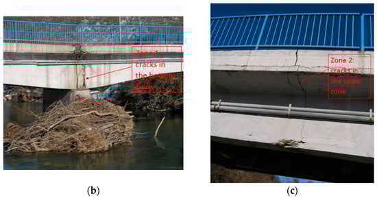 (a) The bridge after the settlement of the river pier, (b) cracks in zone 1, and (c) cracks in zone 2.