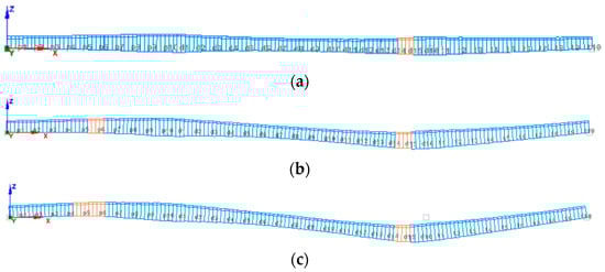 Bridge bending moment diagrams in the downstream girder for several settlement values under the pier S3, including permanent gravity loads, are presented in Figure 7b,c. The initial state shown in Figure 7a refers to permanent gravity loads acting on the deck structure.