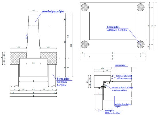 For bridge 1, the deep foundation reconstruction of the settled river pier was not needed, while the settled river pier of bridge 2 required a foundation on piles. Based on the available geotechnical data, the solid rock was at a depth of 5 to 6 m, so two RC piles with a diameter of ø800 mm and a depth of 9 m were designed.