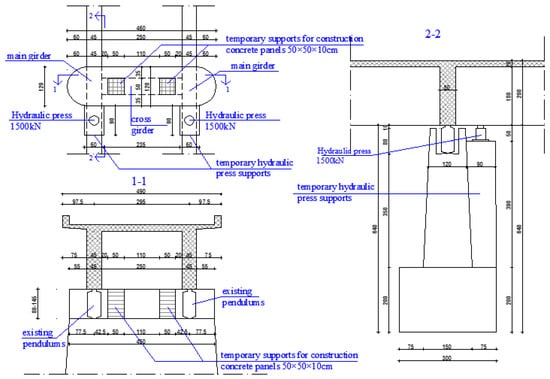To lift up the deck, the temporary RC supports were made on the right face of the pier, 0.75 to 0.95 m thick and 0.60 m wide. These supports are placed just below the main girders supported at their base by the existing foundation. They are constructed so that their upper edge is 0.50 m from the girder’s bottom edge. The existing pendulums are partially demolished so that temporary supports can be placed under the transverse girders and the pendulums can be removed. Additional pier concreting to the required height is done so that the new bearings can be installed. During the lifting, the deck is transferred to the temporary supports by using the press releasing it from the pendulum at the same time. The pier is concreted to the designed elevation after the deck lifting is completed. After the concrete hardens to at least 70% of the designed strength, moveable bearings are installed, and the bridge deck structure is transferred from temporary to newly installed bearings using hydraulic presses. The temporary supports for presses are removed. The disposition of constructed system for deck structure lifting is shown in Figure 22.