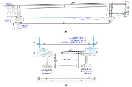 The designed reconstruction of the bridge: (a) longitudinal section and (b) cross-section in the middle of the span.