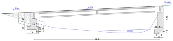 The Marsenic bridge is located in the municipality of Andrijevica. It was built in 1968. The bridge is an RC bridge with a continuous deck system with three spans: 18.0 m, 29.0 m, and 18.0 m, giving a total length of the bridge equal to 65 m. The width of the deck is 3.0 m with two footpaths 0.75 m wide. The bridge is designed with a double-sided longitudinal slope of 2% from the middle to both ends (with a curvature in the middle with a radius of 200.0 m) and a double-sided transverse slope of 2% from the central axis to the footpaths. The longitudinal bridge section, as well as the deck cross-section in the middle of the spans, are shown in Figure 14 and Figure 15.