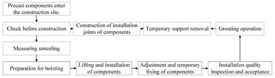 By repeating the above process, a prefabricated building can be built [18]. It is obvious to find that the main process of the prefabricated building at the construction site is to hoist the prefabricated components. A more specific description of the hoisting process of the prefabricated components is shown in Figure 1 (referring to the actual prefabricated construction project, the solid line frame is the basic process of hoisting the prefabricated components; the dotted line frame is the preparation and perfection).