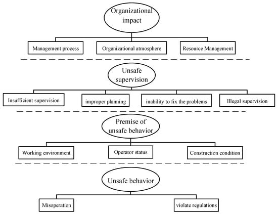 The traditional theory of accident causes is mostly analyzed separately from the four aspects of human, object, management, and environment, without considering the internal relationship between the factors [28]. The HFACS frame takes into account the transitive impact of organizational factors on unsafe behaviors at the individual level, which is more comprehensive and scientific than the independent analysis. The HFACS model was first proposed by scholars such as SHAPPELL in 2000 [29], and it is still used by researchers in various academic fields. The specific analysis of the model includes four levels: unsafe behavior, the premise of unsafe behavior, unsafe supervision, and organizational impact. As shown in Figure 2.