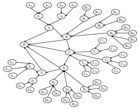 According to the above-established HFACS frame for hoisting construction of prefabricated buildings, the identified factors are converted into nodes in the BN, and the HFACS frame is mapped to the BN structure, as shown in Figure 4. H is the leaf node of BN, that is, the node where the accident happens.
