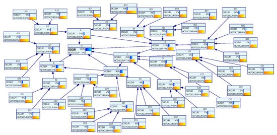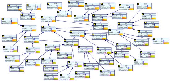 According to the BN constructed in Section 3.2, the BN structure of the safety risk of the prefabricated building hoisting construction was established in the graphical view interface of GeNIe2.3. The forward and reverse reasoning are performed on the BN. Through forward reasoning, the prior probability of intermediate nodes and accident nodes can be obtained, that is, the probability of accidents during the hoisting process of prefabricated components. Through reverse reasoning, the posterior probability of the initial node can be obtained, and the key risk factors can be identified. Input the prior probability of each node obtained in Section 4.1 and calculate the data by GeNIe2.3. The result is shown in Figure 5.