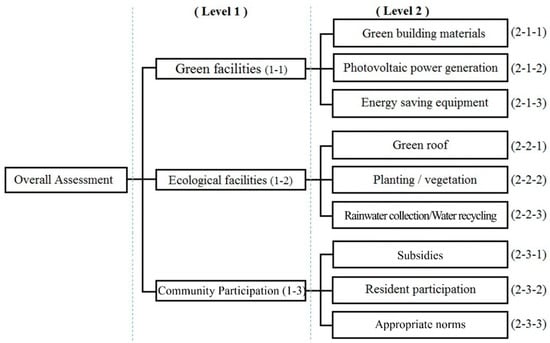 First, we define factors and dimensions by using the Delphi method and surveying experts in the related fields of academia and industry. Three dimensions of green facilities, ecological facilities, and community participation are selected along with the following nine factors: green building materials, photovoltaic power generation, energy-saving equipment (green facilities), green roof, planting/vegetation, rainwater collection/water recycling (ecological facilities), subsidies, resident participation, and appropriate norms (community participation). Then, AHP and FLT are applied to obtain the relative weights for the importance of the factors and the dimensions, which are used for calculating the output values.
