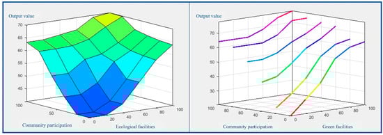 As there are 45 different scenarios in the dimensions of green facilities, ecological facilities, and community participation, the relations between the dimensions need to be presented in a three-dimensional diagram as shown in Figure 4. All the dimensions have output values, which implies that the low-carbon and eco-friendly residential design is appropriate for the development of a community.