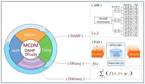 The Delphi-AHP-FLT (DAFuzzy) model has a complex modeling procedure as it needs to combine three methodologies altogether. The DAFuzzy model for the low-carbon and eco-friendly design is shown in Figure 5. It is presented that the hierarchical structure of AHP and FLIS is based on the Delphi process. AHP in the DAFuzzy model confirms the relative weight (wi) of each factor, while FLIS calculates the output value f(xi) of each scenario. The final output value of the DAFuzzy model is expressed as ∑ (wi) × f(xi) and is easy to compare and helpful for decision analysis.