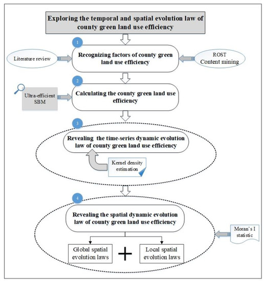 This study’s analysis of the spatiotemporal evolution characteristics of CGLUE in the study areas involved four steps. Firstly, a content-mining tool was used to recognise the CGLUE factors. Secondly, relevant data were analysed by SBM to calculate CGLUE in the study areas. Thirdly, the kernel density estimation was used to reveal the time-series dynamic evolution law of CGLUE. In this third step, each CGLUE corresponded to a kernel density value. Kernel density estimation can convert the discrete CGLUE of each county into a continuous function curve, which is convenient for seeing the trend of the CGLUE in each county over time. Rather than using discrete points that were not always legible, this study analysed the CGLUE time evolution law based on the continuous function curve. Fourth, Moran’s I statistic was used to reveal the spatial dynamic evolution law of CGLUE. In this fourth step, the global Moran’s I statistic analysed the overall change in the spatial agglomeration state in the study areas. The local Moran’s I statistic analysed the agglomeration of CGLUE in each county from the spatial perspective. Detailed information about the research steps is presented in Figure 1.
