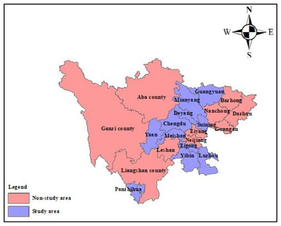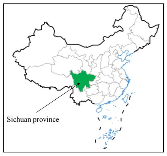 The study area of this research comprises 11 counties located in Sichuan Province, and the boundaries of Sichuan province on the map of China have been marked in green, represented in Figure 3. The counties are Chengdu, Zigong, Panzhihua, Luzhou, Deyang, Mianyang, Suining, Guangyuan, Meishan, Yibin, and Yaan (see Figure 4, where the areas are marked in purple on the map).