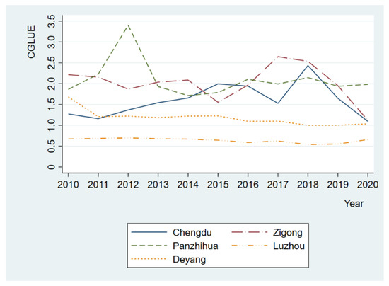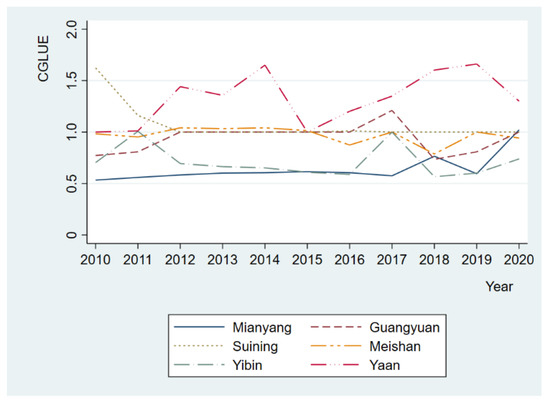 As illustrated by the time-evolution laws shown in Figure 8, Figure 9 and Figure 10, this study has a revolved CGLUE evolution law based on time series. The county’s green land-use efficiency in the 11 counties showed improvement. The main reason for this is that Sichuan Province established the concept of a park city, and the economic development of the city considers the green environment and social sustainability. For example, Figure 10 shows a peak in 2020. There are several reasons for this peak. First, in terms of air-quality improvement, Sichuan Province realised the whole-chain supervision of trucks delivering gas. Second, vehicles transporting concrete can transport no more than 5 tons per trip. Third, Sichuan accelerated the improvement in the urban green travel system and strengthened the integrated development and efficient operation of rail and public transport to reduce carbon emissions and advocate for green travel.