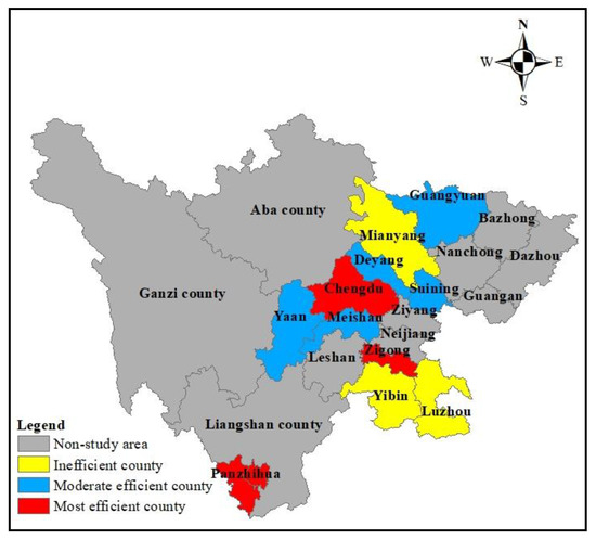 This study indicates that county green land-use efficiency can be perfect sometimes, while inefficient at other times, as shown in Figure 5 and Figure 6. Detailed information on the 11 counties’ CGLUE from 2010 to 2020 is given in the Supplementary File. The most efficient counties are Chengdu, Panzhihua, and Zigong. The top five efficient counties are Panzhihua in 2012 (ρ = 3.399), Zigong in 2017 (ρ = 2.649), Zigong in 2018 (ρ = 2.535), Chengdu in 2018 (ρ = 2.433), and Panzhihua in 2011 (ρ = 2.226). The most inefficient counties are Luzhou, Mianyang, and Yibin. Detailed information is shown in Figure 7. The efficient counties are marked in red, and the inefficient counties are marked in yellow. In Figure 7, the counties with moderate efficiency are marked in blue, and grey areas are not analysed.