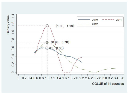 In terms of the time-series perspective of these 11 counties, Figure 8, Figure 9 and Figure 10 show their time-evolution features. In these figures, the x-axis represents the comprehensive CGLUE value of the 11 counties, and the y-axis represents the comprehensive kernel density value of the 11 counties. The distribution location, shape, and polarisation phenomenon of the curve trend reveal the time-series dynamic evolution law of 11 countries’ CGLUE from 2010 to 2020. This study explored several time-evolution laws of CGLUE in the following.