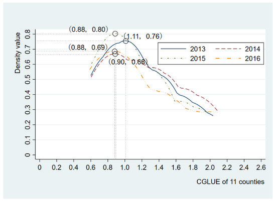 From the time-evolution perspective, the overall level of the 11 counties’ green land-use efficiency has been explored. The peak value of the kernel density curve is always at a high level, and the interval on the right side of the curve continues to decrease, indicating that the overall level of Sichuan Province in 11 counties’ green land-use efficiency is growing.
