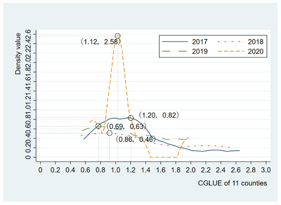 In Equation (2), represents the number of samples; represents the window width;; is a kernel function; denotes the ith sample. The kernel functions contain several types, including the uniform kernel, the Gauss kernel, the Epanechnikov kernel, and the quadric kernel. The different kernel functions have little impact on the results. This study used the uniform kernel to conduct the kernel density estimation. It uses uniform kernel density to convert the discrete CGLUE of each county into a continuous function curve, which is convenient for analysing CGLUE time evolution law.