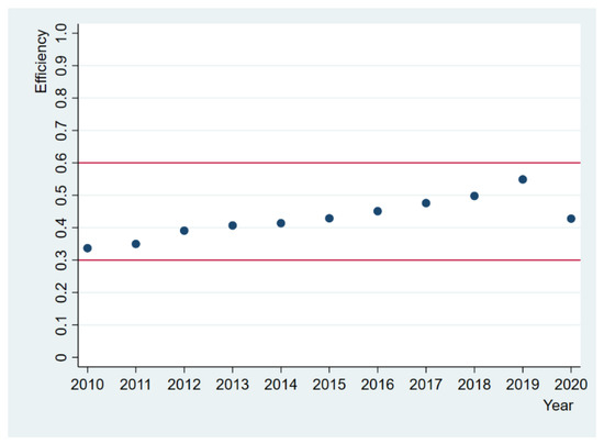 The findings in Table 2 suggest that the administrative area, total investment in fixed assets by region, number of employed persons in secondary and tertiary industries, GDP in secondary and tertiary industries, the average wage of staff and workers, basic statistics on per capita park green area, carbon emissions of land, the volume of industrial wastewater discharged, the volume of industrial sulphur dioxide emission, and the volume of industrial soot (dust) emission are critical factors in analysing CGLUE. In contrast to previous studies, this study indicates that the carbon emissions of land should be considered an undesired output [60,61]. With the targets of carbon reduction, economic improvement, and sustainable social development, how much carbon will be generated by each unit of land resource is particularly important [62,63]. The carbon emissions of land can measure land resources’ coal consumption, natural gas emissions, and electricity consumption.