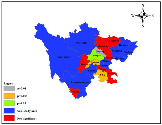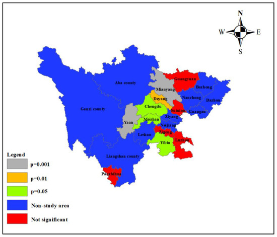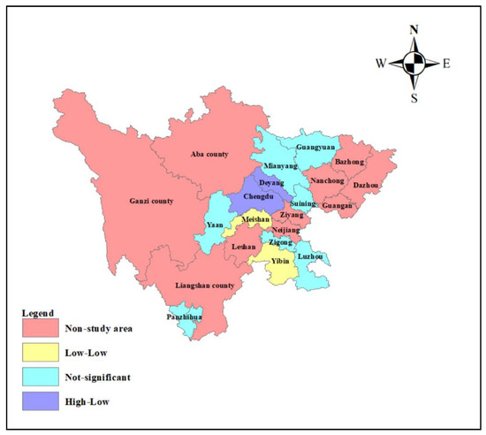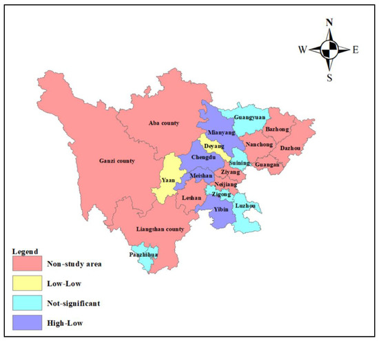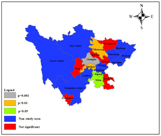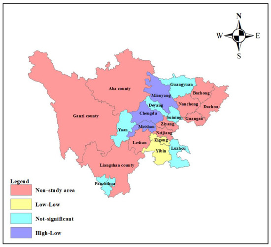 From the spatial evolution perspective, the local Moran’s I statistic of the CGLUE represents both the high–low and low–low types. The high–low CGLUE agglomeration areas are mainly distributed in Chengdu, Mianyang, Meishan, and Yibin. The low–low CGLUE agglomeration areas are mainly distributed in Deyang, Yaan, and Zigong. These high and low CGLUE agglomeration areas show the high-speed exchange of resources in recent years and that the CGLUE gap between counties is shrinking and converging.