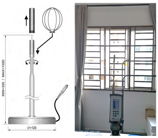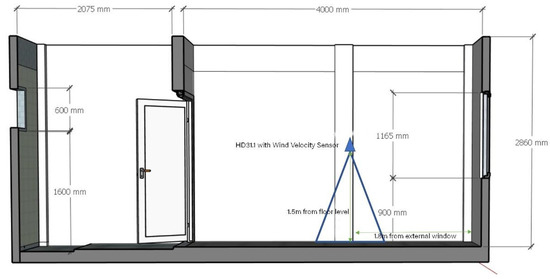 Field measurements were conducted for 8 full days between 26 March 2022 and 2 April 2022 in the selected case study unit, which was located on Level 3 in Block B. The field measurements were carried out for at least 1 week to sufficiently cover variations in climatic conditions in Malaysia, which is hot and humid throughout the year. The indoor air velocity (m/s) of the bedroom was recorded with a single-probe Delta Ohm HD31.1 Portable Multifunction Instrument and Data Logger, which has a measuring accuracy of ±0.02% (excluding probe-related errors) at 20 °C. The data logger was set up in the middle of the room at 1.5 m above the floor level and 1.8 m away from the external-facing window of the room, as illustrated in Figure 5 and Figure 6. The corresponding software, installed on a personal computer, was used to set the data logger to read measurements at 5-min intervals.