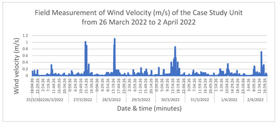 The results of the field measurements are shown in Figure 7. The results from the initial set-up day on 25 March 2022 were disregarded, as the recordings only commenced in the evening. The average wind velocity measured in the case study unit was 0.019 m/s, with a range of 0–1.1 m/s. Based on the recorded data, 69.56% of the total field measurements recorded 0 m/s. The wind velocity exceeded 1 m/s only thrice—at 14:44 and 14:29 on 27 March 2022, and also at 14:34 on 28 March 2022—due to increased wind flow during rainy periods. This represented 0.13% of the measured duration.