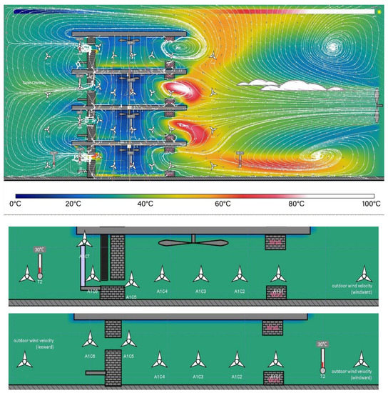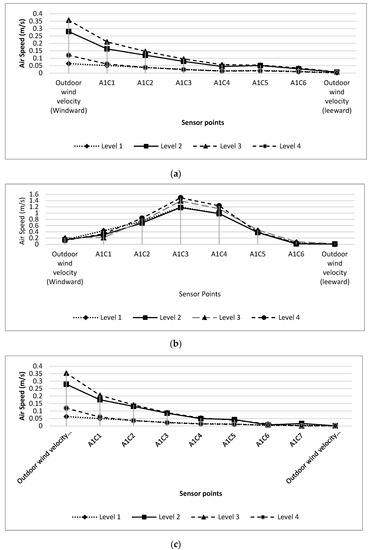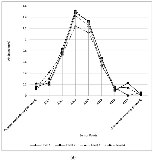 All four bedroom and bathroom scenarios were modelled and then replicated on four levels, to mimic the typical repetitive section of an apartment building. Eight wind velocity sensors were then positioned on every level, yielding a total of thirty-two sensors. At each level, two sensors were located outside the building model, on the windward and leeward sides, respectively, while another six were distributed across the bedroom and the bathroom-cum-solar-chimney, as illustrated in Figure 9. The results of the simulations were as shown in Figure 10.
