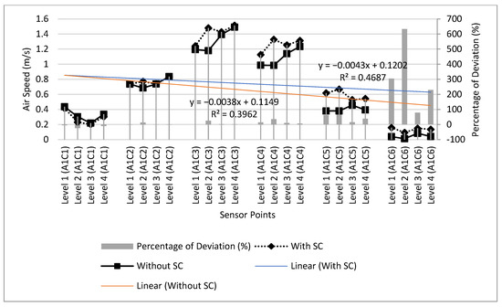We determined an R-squared value of 0.4687 for the scenarios with the SC, suggesting that the induction of the SC effect is able to improve natural airflow by over 45% in an apartment unit in Malaysia. However, the absence of a ceiling fan negatively affected the performance of the SC (see Figure 11), with the exception of Level 2, in which several sensors closer to the windward aperture still generated a positive effect, and a room with neither a ceiling fan nor SC performed better than an SC-only room.