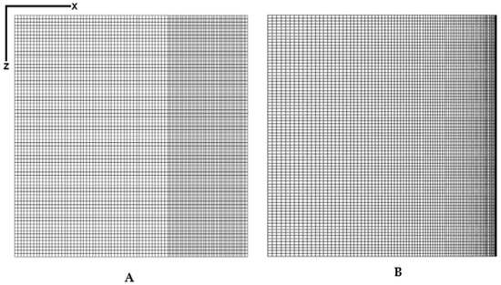 We considered a piece of wall with volume 1 m 1 m 1 m. However, no physical quantities are changing in the y-direction (perpendicular to the surface of Figure 1 and Figure 2), thus that dimension is irrelevant. It means we deal only with a cross-section, which is a two-dimensional problem from the mathematical point of view and thus we can use . So, we constructed several meshes of size 1 m2, which means . The shape of the cells is square in the equidistant mesh and rectangular in the non-equidistant meshes. The heat capacity of the cells can be given as , while the thermal resistance in the x-direction has the approximate formula , where is the surface element perpendicular to x. Since now it can be given as , the horizontal and vertical resistances can be given in case of a homogeneous material and uniform mesh as