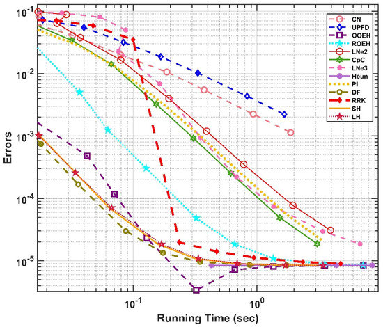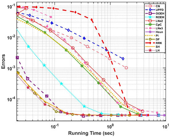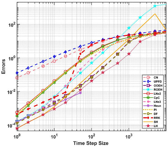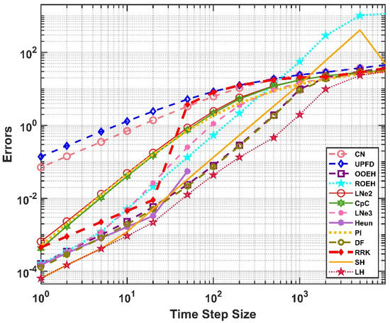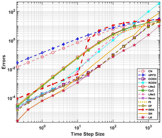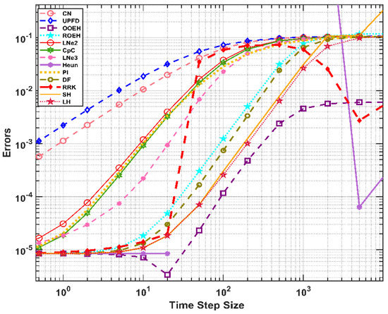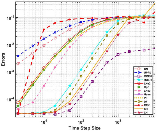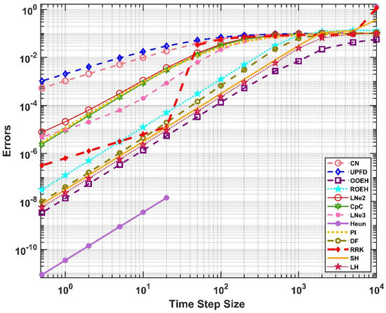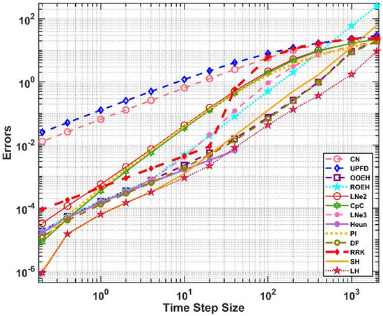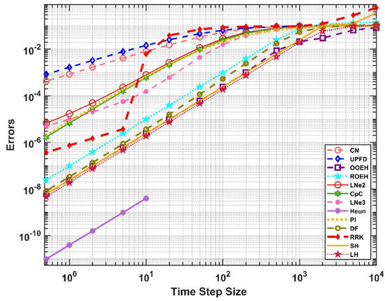 One can see that now there are no residual errors. The reason for this is that the reference solution uses the same space discretization as the examined methods, thus this error disappears when the difference of the solutions is calculated as in Equation (16).