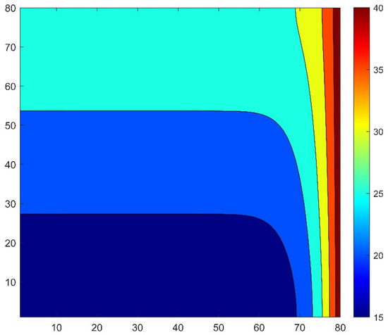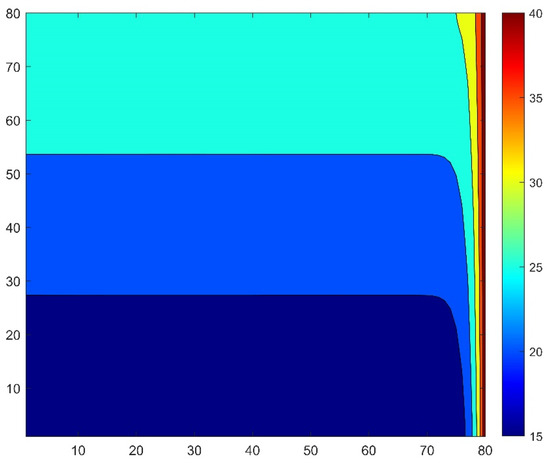 which is second order in . Let us now present the discretization of Equation (2) based on the usual discretization of Equation (1). One can find more details about this procedure in Chapter 5 of book [37] for the case of underground reservoirs. Let us suppose that α, k, c, and ρ, the quantities describing the properties of materials, are functions of the space (and time) variables instead of being constants. Examine a one-dimensional, equidistant grid and discretize the second-order space derivatives by the standard central difference formula, where k is a function of x and cannot be simply merged with c and ρ. Thus, we have
