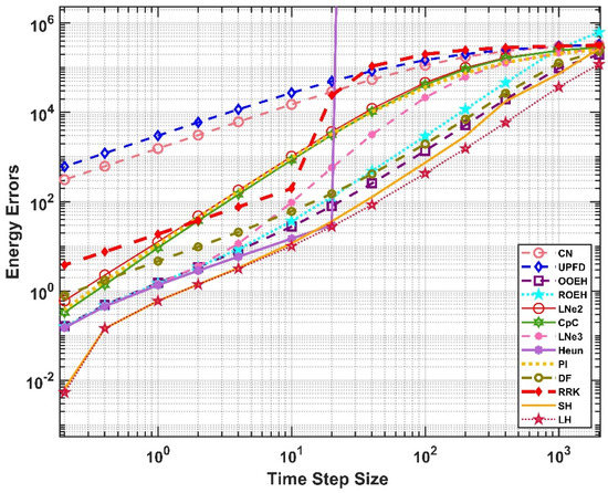 The energy errors defined in (17) as a function of the time step size for the non-equidistant mesh.