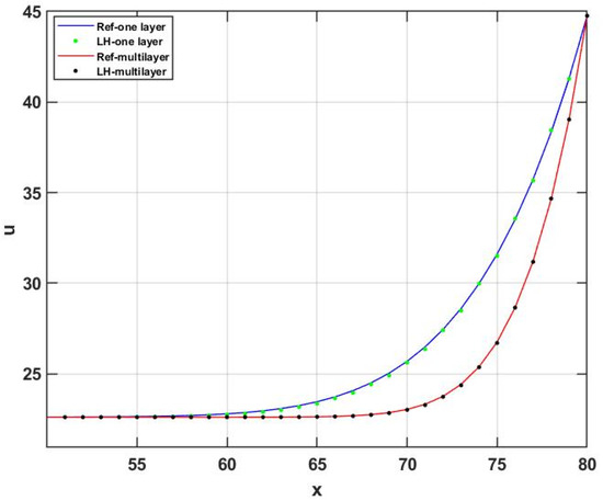 The temperature as a function of the cell index in the x direction at the middle row in the case of the reference solution (Ref) and the leapfrog-hopscotch (LH) method for in the case of the one-layer wall and the insulated wall using an equidistant grid.