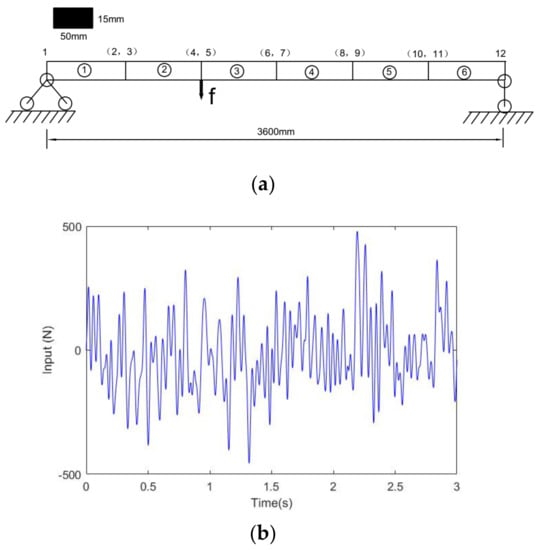 A simply supported beam subjected to white noise excitation. (a) A simply supported beam with unknown parameters; (b) broadband white noise excitation.