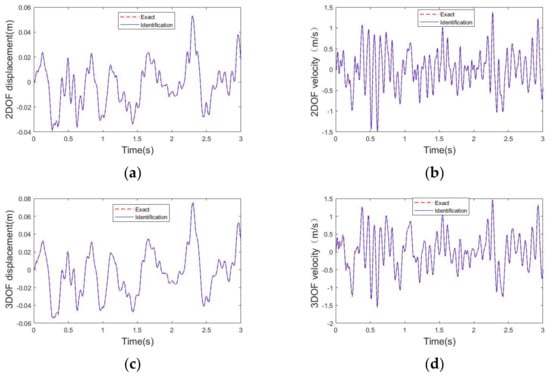 Comparisons of the exact and identified displacements and velocities. (a) Comparison of the exact and identified ; (b) comparison of the exact and identified ; (c) comparison of the exact and identified ; (d) comparison of the exact and identified .