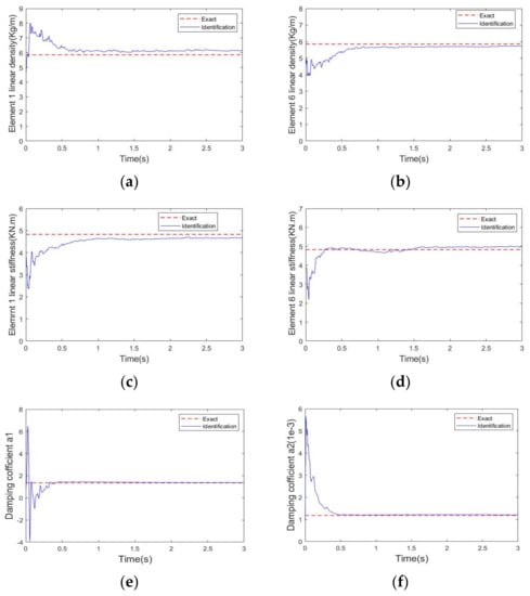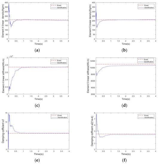 The convergence of six parameters is demonstrated in Figure 6. It shows that the identified linear density of element 4 and element 5, the identified linear stiffness of element 4 and element 5, and the dumping coefficients can be identified effectively. Table 2 provides all the elements’ parameter identification values, true values and identified relative error of all elements. It is shown that all the elements’ parameter identification results meet the accuracy requirements and the relative error of the identified mass, stiffness and damping coefficients relative to their true value is less than 5%.