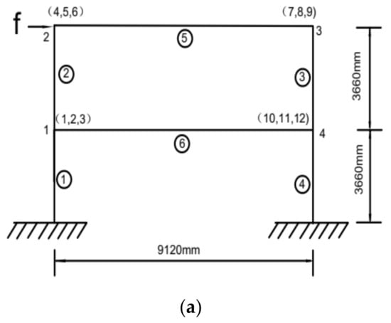 In order to further verify the effectiveness of the proposed algorithm for the joint state-parameter identification of the structure with a non-diagonal mass matrix under unknown mass, a plane frame shown in Figure 4 is investigated in this case. A one-story two-span plane span was applied here for numerical simulation. All beams and columns adopt a consistent mass matrix and consistent stiffness matrix; the mass and stiffness matrix detailed representation are shown in Appendix B. Rayleigh damping is assumed in this numerical simulation case. The bases are assumed to be fixed. Therefore, the plane frame contains a total of 12 DOFS, and each node point has three degrees of freedom (horizontal, vertical and rotational).