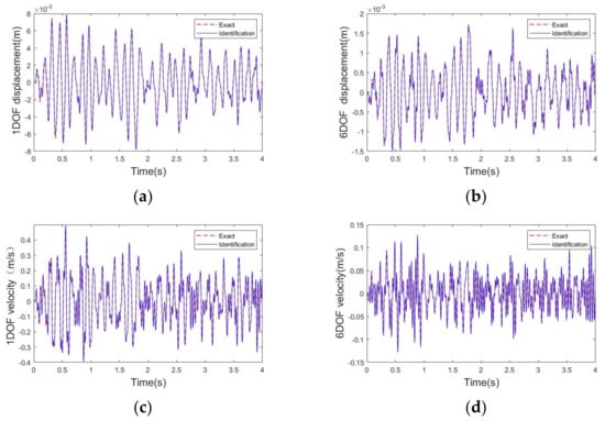 Figure 5a,b show the comparisons of the identified and exact time histories of Horizontal displacement of nodal 1 and rotational displacement of nodal 4. The identified time histories and the exact time histories are depicted in Figure 5c,d, respectively. It is shown that both structural displacement and velocity responses can be identified effectively.