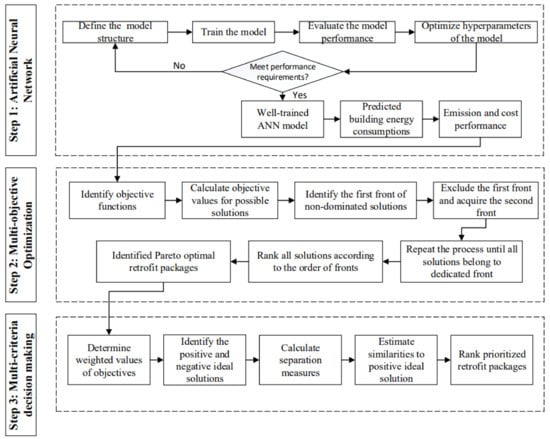 In this study, an ANN-based energy retrofit evaluation framework was developed to evaluate the energy performance of a wide range of retrofit packages and identify optimal retrofit solutions. The developed framework mainly consists of three steps: (1) develop an ANN model as a surrogate model to imitate the building energy modelling process and thereby estimate the energy consumption of retrofit packages; (2) calculate carbon emissions and energy costs by integrating emission and cost impact data with energy consumption results. Then, utilize a multi-objective optimization approach to determine Pareto optimal retrofit solutions while considering the emission and cost performance; (3) apply the multi-criteria decision-making analysis to evaluate the optimal retrofit solutions and select the best retrofit packages. The overall methodology of this study is shown in Figure 1.