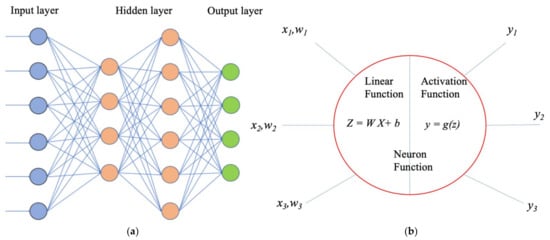 The structure of an artificial neural network: (a) the structure of neural network; (b) neuron function.