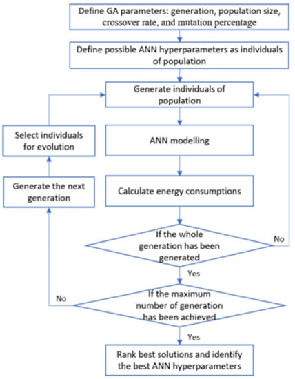 A genetic algorithm (GA) is an evolutionary algorithm utilized to address optimization problems in computational mathematics []. Evolutionary algorithms were originally developed from phenomena in evolutionary biology, including heredity, mutation, natural selection, and hybridization. For an optimization problem, a variety of candidate solutions can be abstractly represented as chromosomes so that the population evolves towards better solutions. This research adopted a well-designed GA tool to identify the best structure and hyperparameters of ANN []. The ANN-GA model implementation is described in Figure 3. The considered ANN hyperparameters and GA parameters are shown in Table 1.