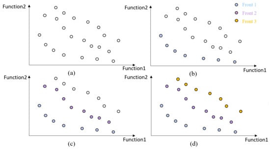 - Repeat Step (4)’s process until all candidate retrofit solutions belong to different fronts, as presented in Figure 4d.