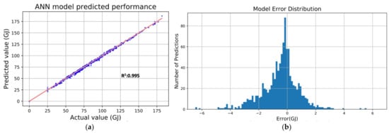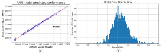 Empowered by big data, ML algorithms have been increasingly employed for prediction in various engineering-related fields []. This paper employed an ANN to predict building energy consumption and thus evaluate the environmental and economic performance of possible retrofit packages.