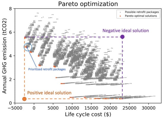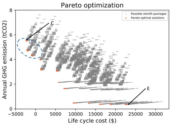 According to the above-mentioned analysis, Pareto optimal retrofit solutions can be identified, as shown in Figure 7. The grey points represent possible retrofit packages, while the red points represent Pareto optimal solutions. Decision-makers can choose different retrofit solutions according to their budgets and emission reduction target. As shown in the figure, the solutions located in the blue oval are regarded as primary solutions, which can reduce carbon emissions and achieve a negative life cycle cost. This means that the energy cost savings are larger than initial retrofit costs. In practice, governments can provide awareness information programs to help occupants learn about the cost-saving benefits of retrofits. However, other Pareto solutions are recognized as secondary solutions. These solutions can reduce more carbon emissions but need more investments. Governments need to provide financial support for occupants, such as grants and rebates, to reduce their economic burdens and encourage them to implement energy retrofits.