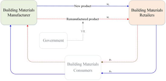 Under the decentralized decision-making model (VR model), the closed-loop supply chain Stackelberg model composed of building material manufacturers and retailers is a master–slave game model, in which the manufacturer is the leader and the retailer is the follower. Manufacturers and retailers are independent of each other, and their decision-making goal is to maximize their own profits. In order to increase the enthusiasm of manufacturers to produce CDW remanufactured products, the government provides remanufacturing subsidies to manufacturers.